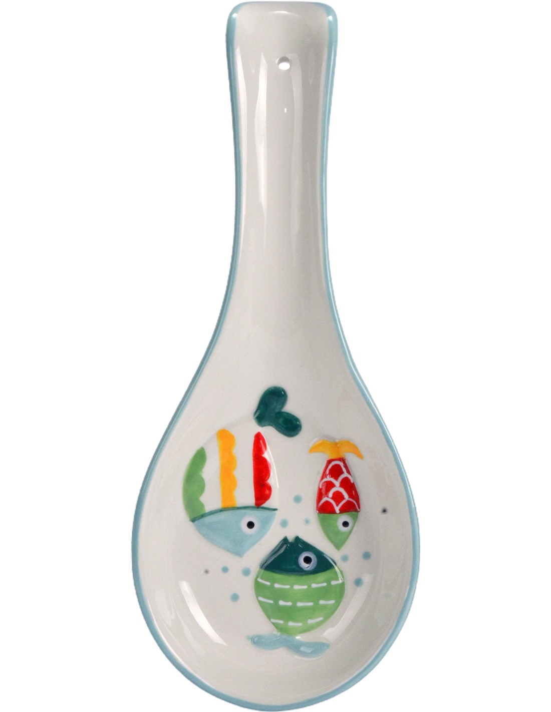 Posacuchara de ceramica decorada Peces colores. Cerámica artesanal. Cerámica esmaltada. Cuchara de cerámica. Materiales cerámica. Horno cerámica. Utilidad en microondas y lavavajillas. Cucharas artesanales. Posacuchara artesanal. Arte y cerámica. Cuchara decorativa. Posacuchara para posar la cuchara en el cocinado. Cuchara para decoración. Cuchara para regalo. Cuchara pintada a mano. Cuchara para vajilla. Vajilla de cerámica